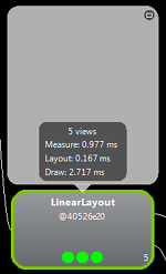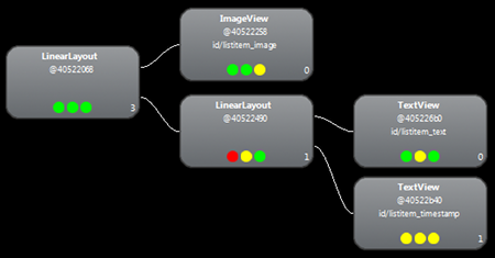 Hierarchy Viewer 会让你选择设备或者模拟器上正在运行的进程,然后显示其 Layout 的树型结构。每个块上的交通灯分别代表了它在测量、布局和绘画时的性能,帮你找出瓶颈部分。