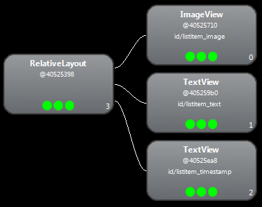 hierarchyviewer 这个工具在 <sdk>/tools/ 中。当打开时,它显示一张可使用设备的列表,和它正在运行的组件。点击 Load View Hierarchy 来查看所选组件的层级。比如,下图就是前一个图中所示 Layout 的层级关系。